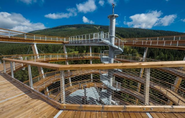 Ścieżka w koronach drzew znajduje się w sercu majestatycznych lasów Karkonoskiego Parku Narodowego w Czeskim mieście Janské Lázně. Wspólnie będziemy podziwiać piękno tutejszych lasów dosłownie od koron aż po korzenie drzew. Trasa o długości ponad 1300 m poprowadzi przez las, w którym znajdują się zróżnicowane gatunki drzew.